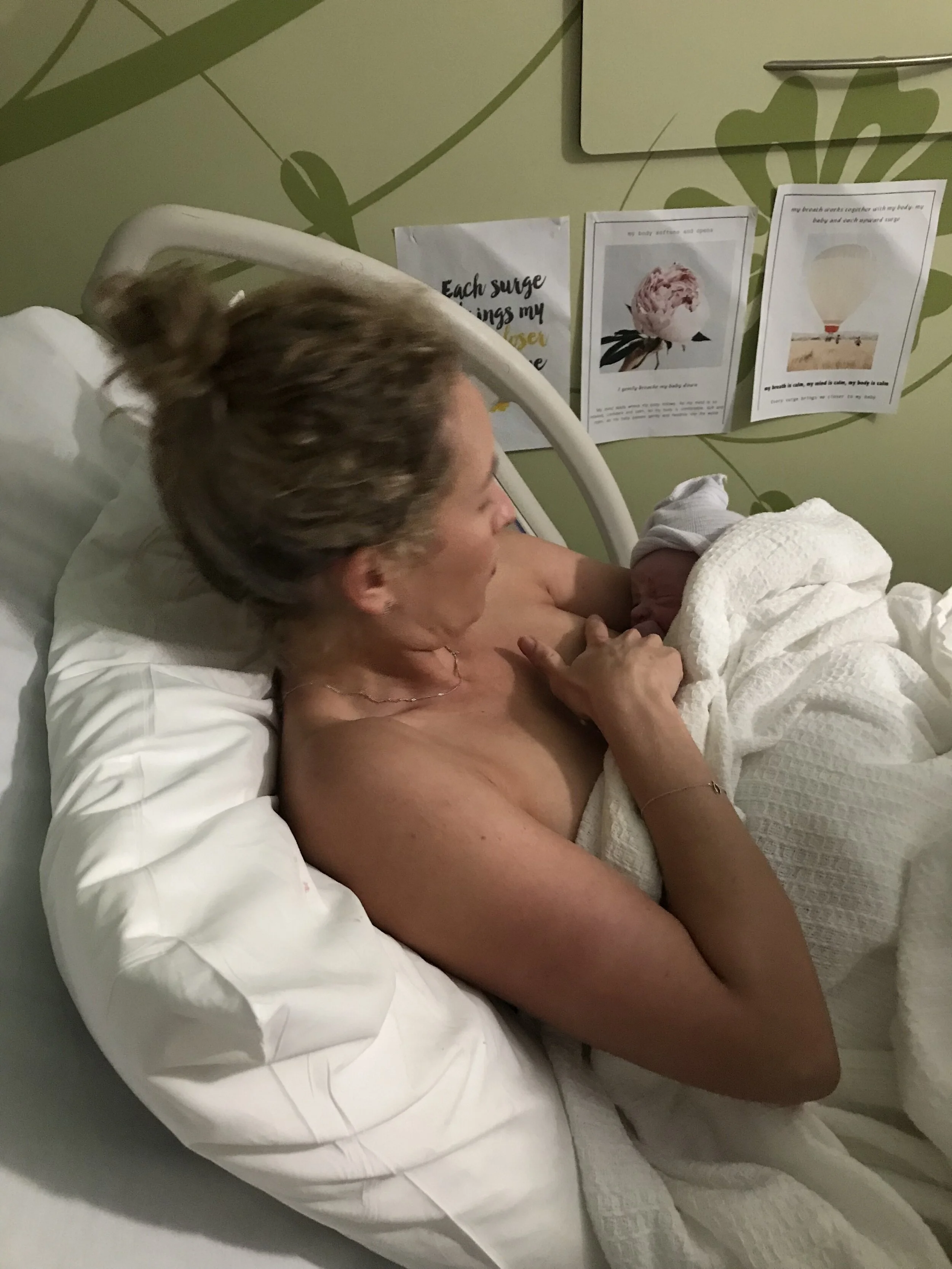 I could feel the stages my body was moving through and found this comforting because I knew if I kept it up it wouldn’t take long. I kept focusing on all my affirmations, repeating them in my head - ‘my mind leads my body’, ‘the sensations are never too strong for me because they are me’. I used my surge breathing - visualising my uterus working just like it should be; strong, rhythmic, efficient. The back pain I was experiencing was unbearable at times but I had trained my mind to stay calm and just embrace each surge like a wave; coming and going. Mike and my doula helped place pressure on my pelvis with each contraction making it easier to manage. It was a very similar sensation to the birth of my daughter but I could just feel it stronger and far more intense from the get go. I was so grateful to have my doula (also a fully trained midwife) by my side. She was so nurturing and gentle. Like a mother to me who trusted wholeheartedly in my capacity to get through birth. She reminded me to stay soft and relax between my surges. At one point I vividly remember my legs being so rigid as I braced myself holding on to the hospital bed waiting for the next surge, her gentle reminder to let go encouraging me to soften and release.